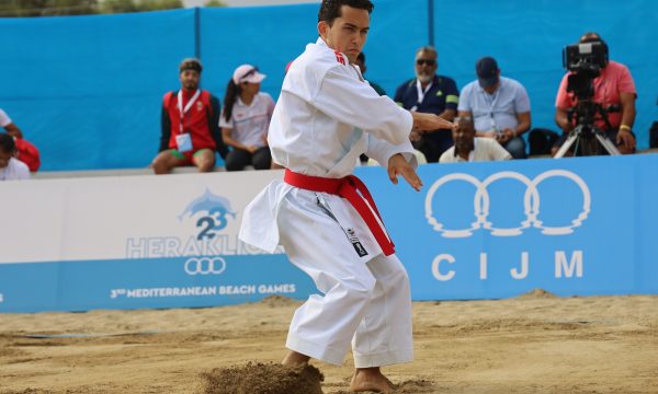 Karateisti kosovar Ventor Gjuka, garoi sot në Lojërat Mesdhetare në Rërë Heraklion 2023, disiplina e katave në rërë.