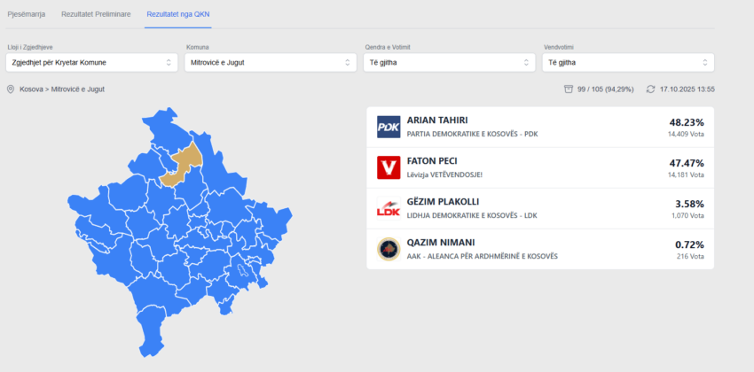 Pas verifikimit të 94.29 për qind të votave, Arian Tahiri ka marrë 48.23 për qind të votave.