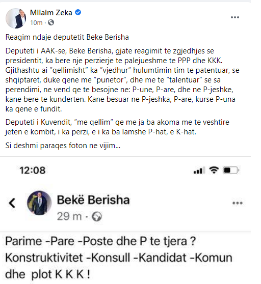 Përderisa Bekë Berisha, në postimin e tij ka përmendur parimet, paratë, postet dhe siç ka thënë “P” të tjera, dhe plot “K”, si konsullat, komunat, konstruktivitetin etj.