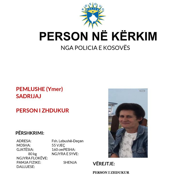 55-vjeçarja është nga Rahoveci, derisa organet kompetente lusin qytetarët që kushdo që ka informacion për vendndodhjen e saj, të lajmërojë Policinë e Kosovës apo të lajmërohet në stacionin më të afërt policor.