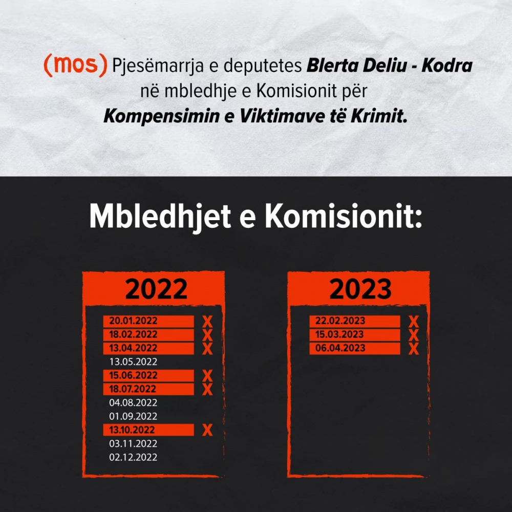 Më poshtë gjeni pjesëmarrjen apo më saktë mospjesëmarrjen e saj në mbledhjet e Komisionit për të cilat anipse nuk ka marrë pjesë është kompensuar financiarisht.